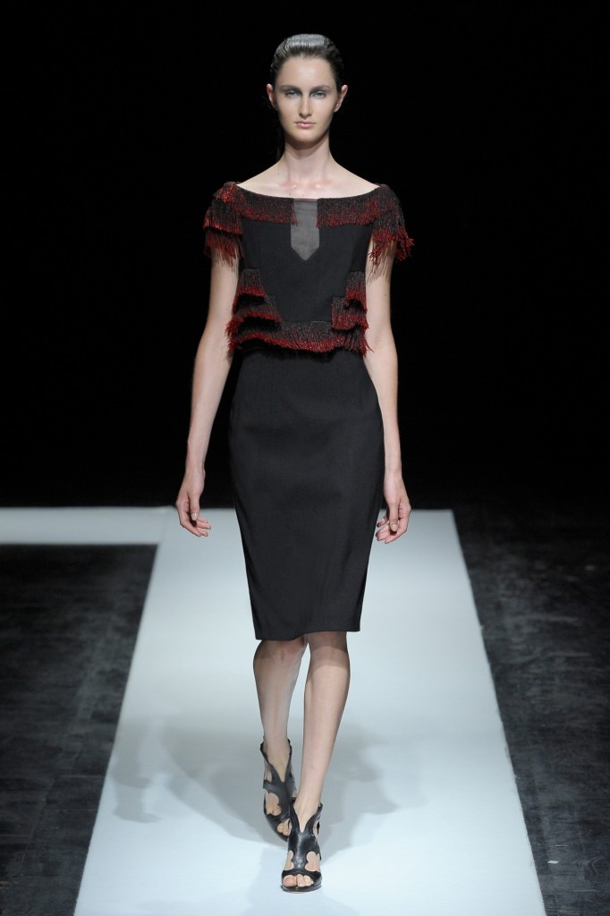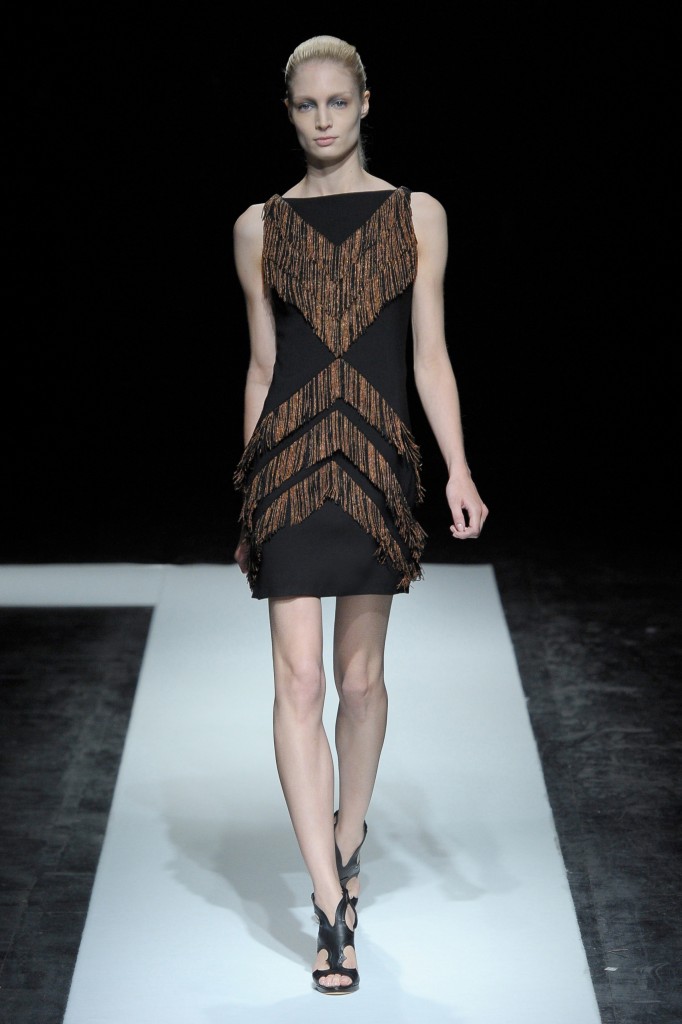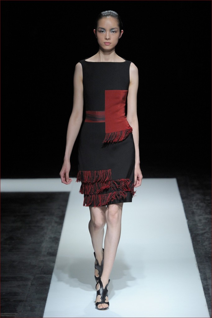 Puis les ombres prennent peu à peu le pouvoir. Les premières silhouettes très lumineuses font rapidement place à des tenues plus sombres. La soie habotai et les plumes d’autruche se teintent de rouge sang. Les robes sans manches ont des découpes plus géométriques et s’ornent progressivement de franges de perles se dégradant du pourpre au noir.