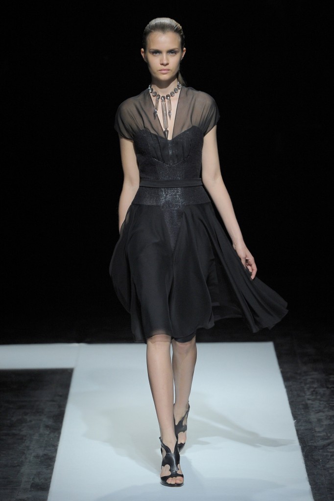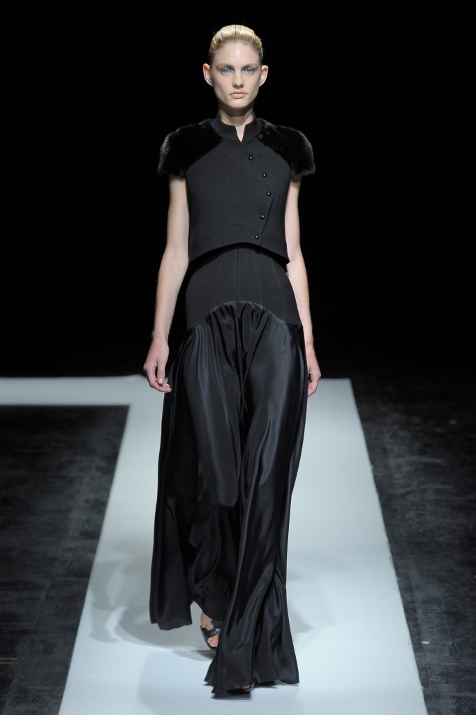 Les lignes restent très structurées et graphiques mais avec une nouvelle légèreté. Inspiré par les drapés si chers à Madame Grès, Maxime Simoëns ajoutent des découpes drapées d’organza sur les hanches et dans le dos des robes en une sorte de traine aérienne éthérée. De nouveau, l’impression de mouvement fluide est perceptible comme si un fantôme – ou une ombre quand l’organza s’assombrit – suivait la femme pas à pas.