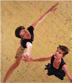 Placée devant la fenêtre, elle fait écho à Flying, l’une des deux toiles exposées de la jeune peintre chinoise Yu Hong. Sorte de métaphore du sentiment de fugacité et d’instabilité, les toiles de la star montante de la peinture chinoise représentent des personnages se détachant sur fond d’or.