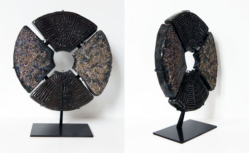 Le premier, le Cosmos fait référence au souffle et aux cycles de l’univers. La céramique prend un aspect métallisé par endroits rappelant la poussière d’étoiles et possède de nombreuses incisions sous la forme de traits. La géométrie est en rapport avec le Yi Jing.