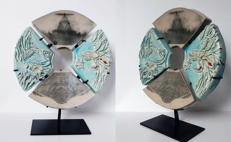 Le second renvoie à l’Environnement humain dans une quête d’un carpe diem à travers la quiétude des paysages. La céramique est en grès sérigraphié de montagnes molles et de rizières avec des orchidées sur une faïence ajourée en émail craquelé bleu ciel.