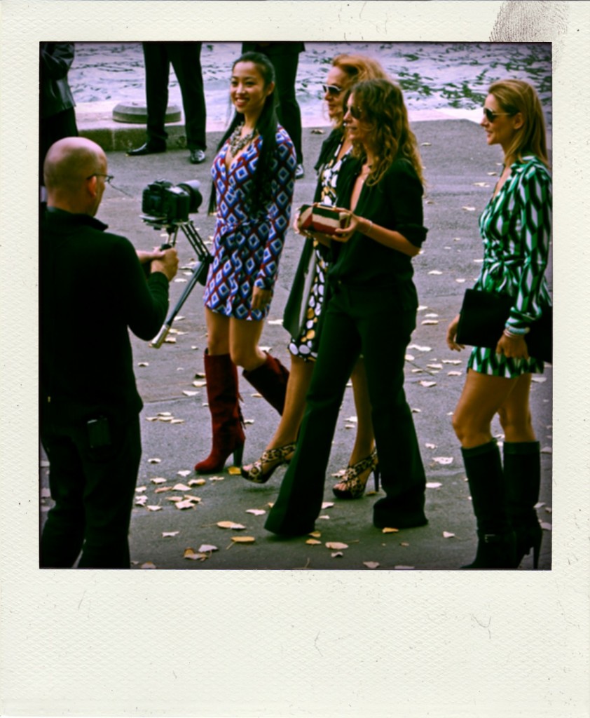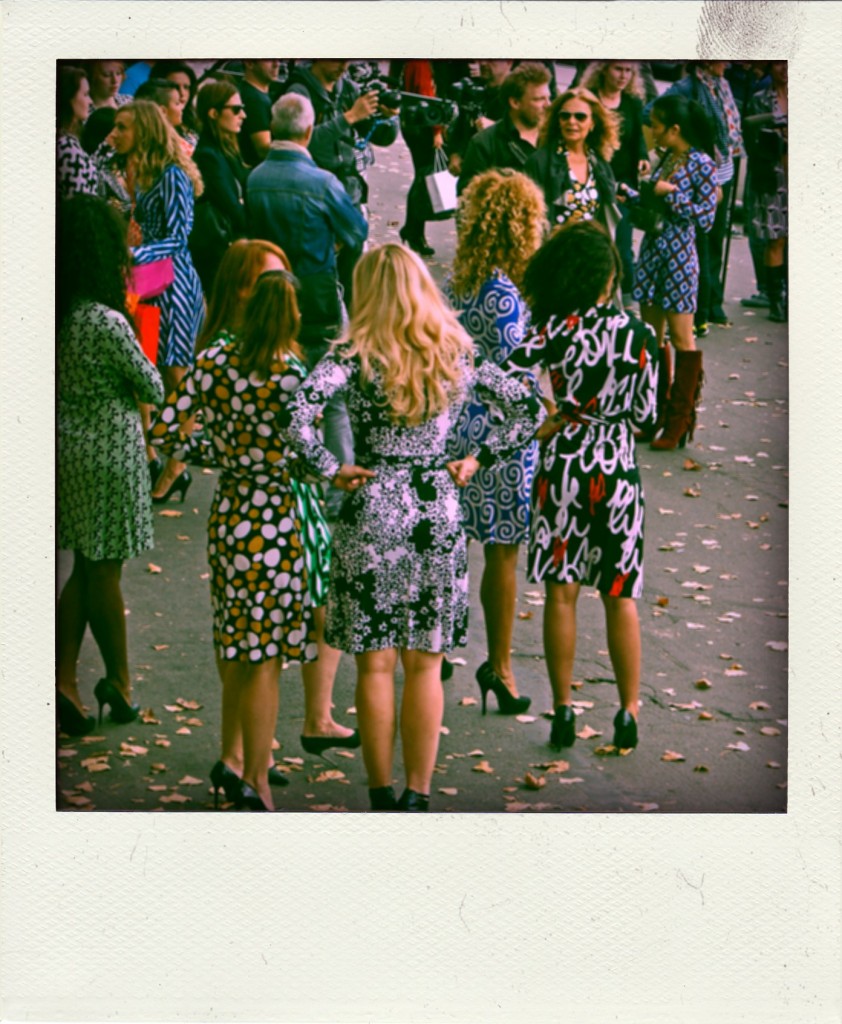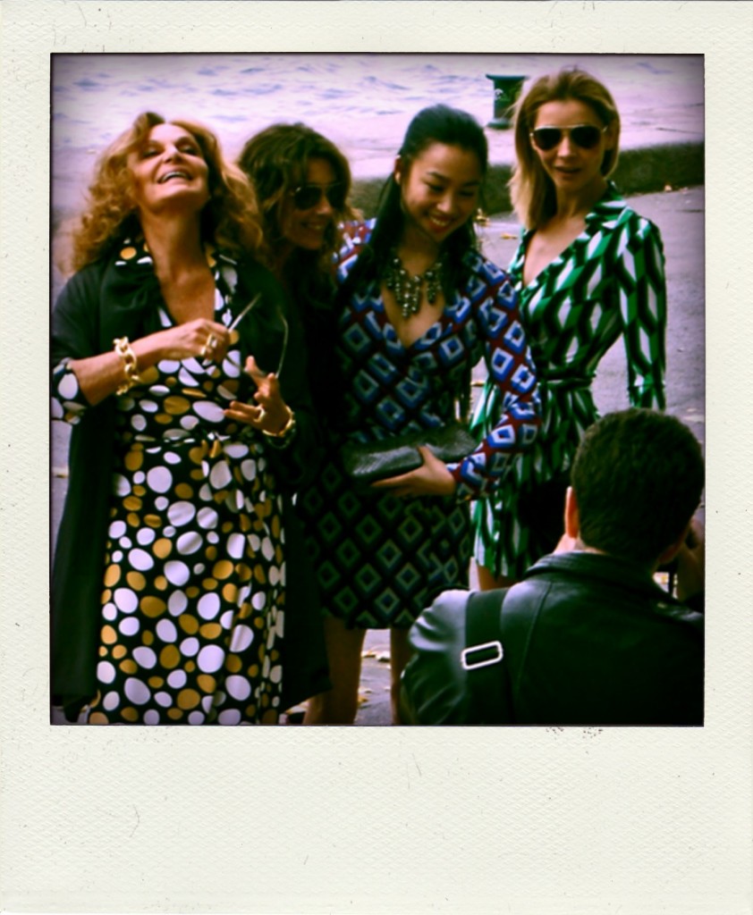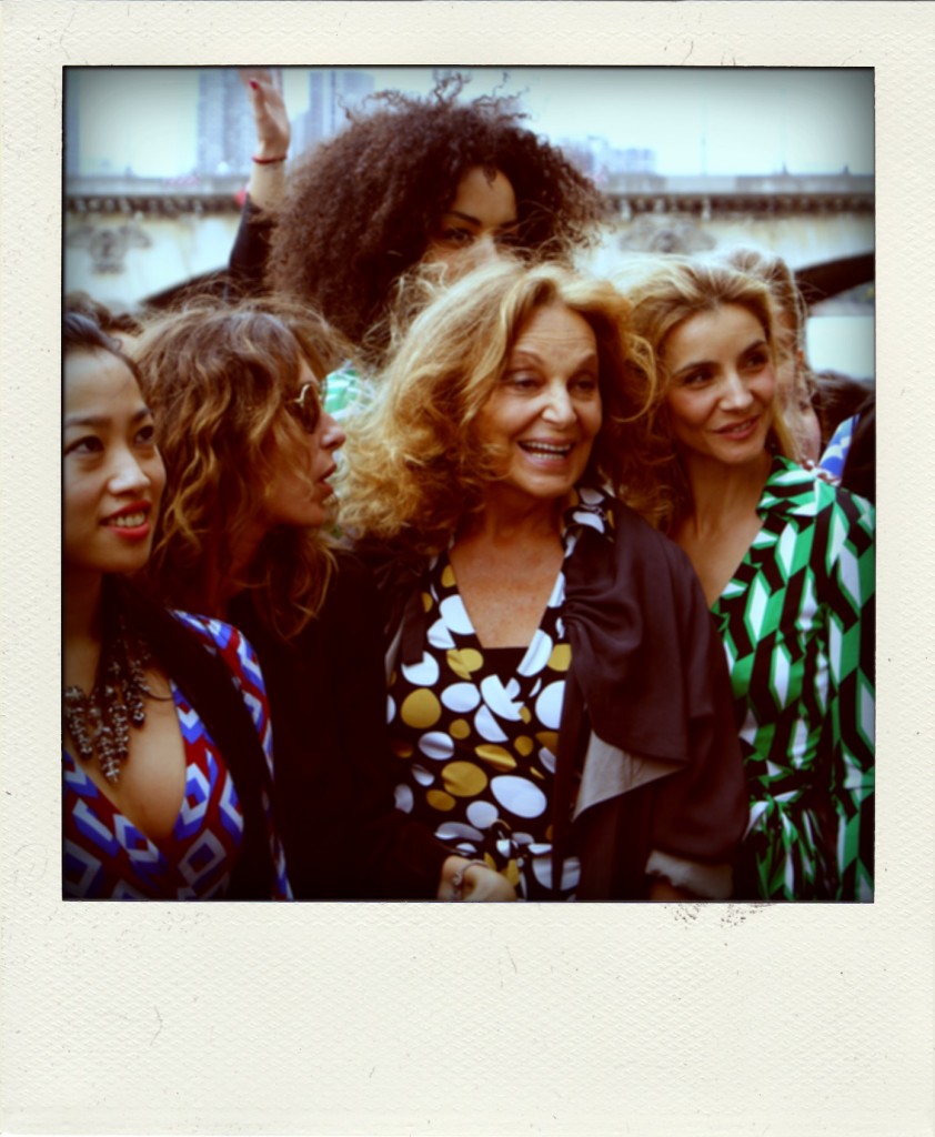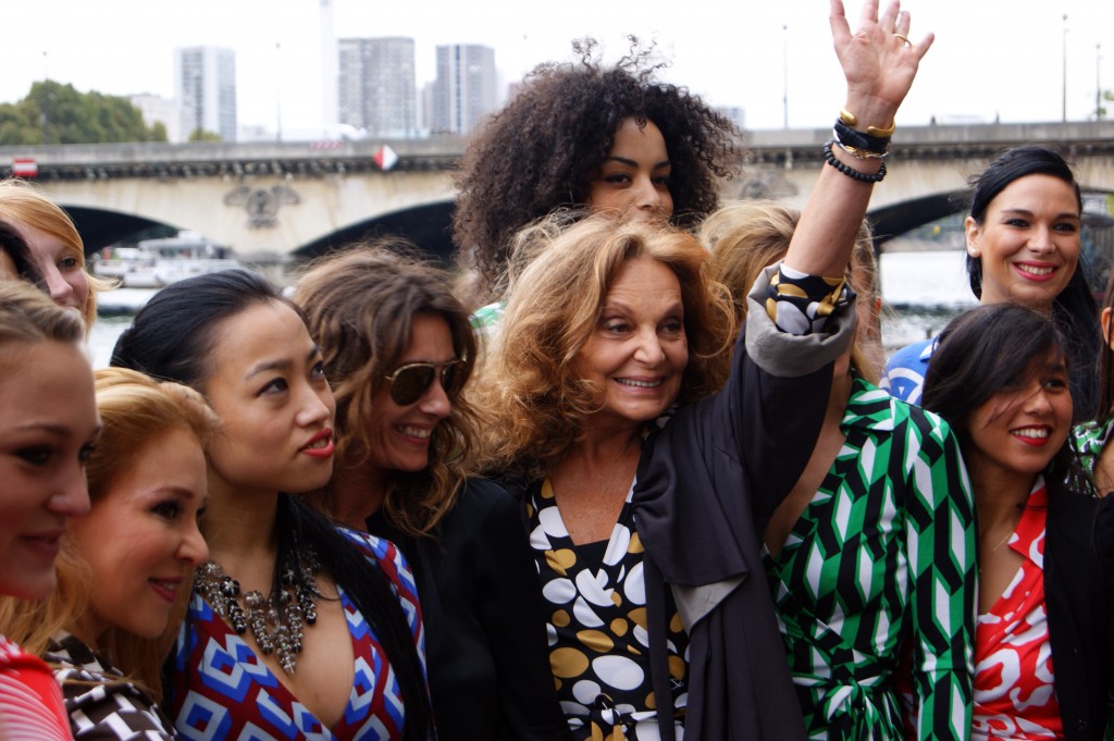 Rendez-vous était donné Quai Debilly, face à la Tour Eiffel. Diane Von Furstenberg, arrivée dans une Fiat 500 spécialement relookée pour l’occasion, a rejoint des dizaines de jeunes femmes vêtues de la fameuse wrap dress.