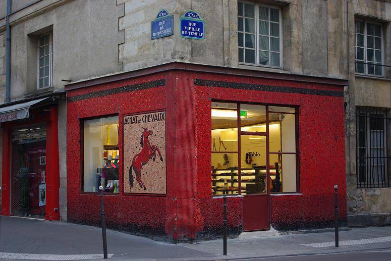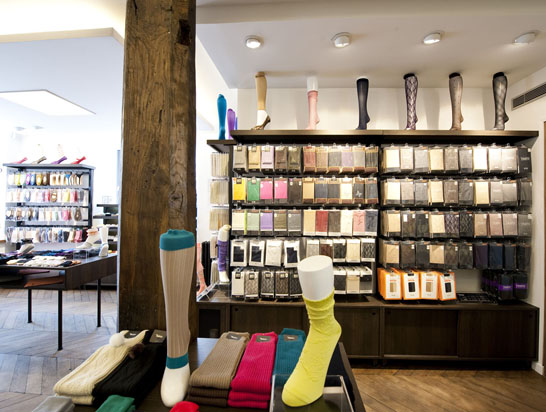 Ouverte depuis trois ans, la première boutique Tabio est une petite boutique accueillante et intimiste à l’angle de la rue Vieille du Temple et de la rue du roi de Sicile dans le Marais. Située dans une ancienne boucherie chevaline, elle est facilement reconnaissable grâce à sa façade en mosaïques rouges. Et en vitrine, des jolies gambettes permettent d’admirer les créations colorées de la marque.