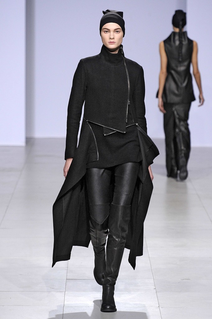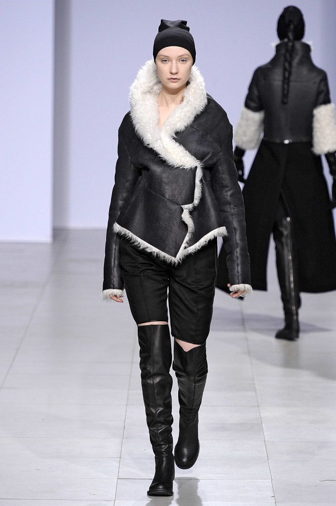 Mais point de candeur ni de perles pour la femme Peachoo+Krejberg. Mystérieuse, elle est avant tout aventurière et ne passe pas inaperçue toute de cuir vêtue. Gants, tunique, tregging, jupes et poches de manteaux se parent de cuir. De longues bottes mi-cavalières mi-cuissardes complètent une silhouette parfaite pour battre le pavé.