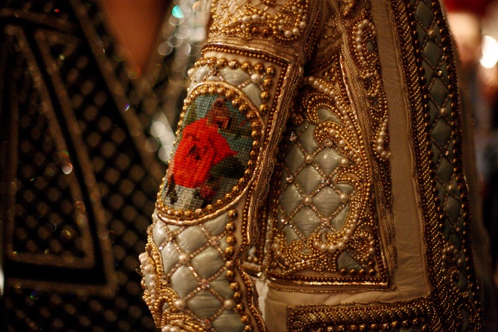 « La collection est TRÈS luxueuse, inspiré par les œufs Fabergé. Nous sommes en Russie, le tsar, l’opulence. Pour équilibrer tout cela, nous aviosn besoin d’aller vers plus de simplicité, une poudre simple sur la zone T, pas de fond de tient, un petit peu de correcteur, vraiment léger et nous avons brosser les sourcils avec un peu de mascara séché noir ou brun pour donner un peu d’énergie et du baume sur les lèvres. » explique le maquilleur vedette.
