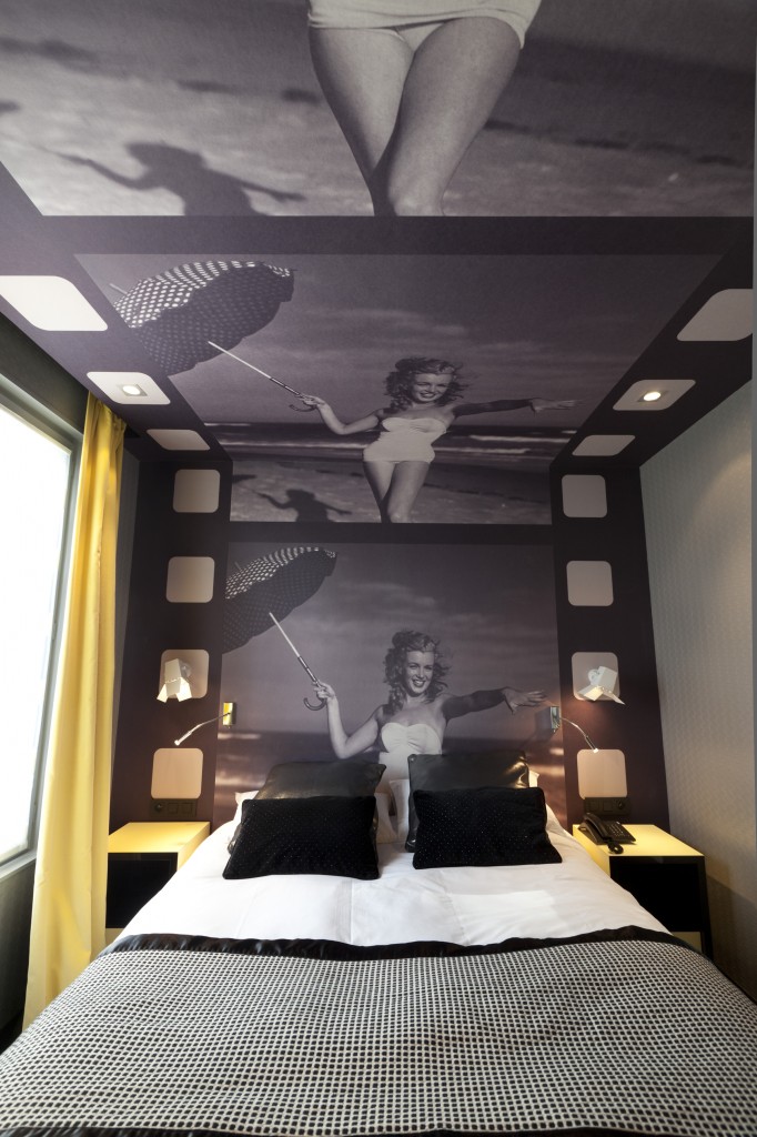 Projecteurs anciens dès l’entrée, fauteuils de metteur en scène dans la salle de petit-déjeuner, décoration aux allures de pellicule de cinéma dans certaines chambres, vieux films diffusés dans l’ascenseur… Attention, vous allez vivre une expérience hors du commun dans un véritable décor de cinéma à l’atmosphère fifties né de l’imagination prolifique de Vincent Bastie.