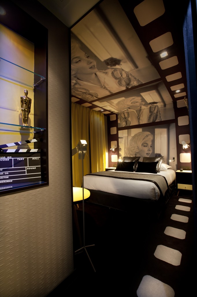 L’univers Hollywood est dédié au monde du cinéma. L’ambiance pellicule de cinéma se déroule au sol, aux murs et au plafond. Ponctuée de touches dorées, les chambres sont une véritable invitation à dérouler son propre film. Avec ses luminaires façon éclairage et ses reproductions d’Oscars, elle séduira les amateurs du 7ème art et qui sait leur donnera quelques idées…