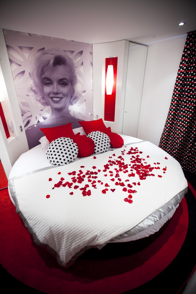 L’univers Rouge avec son lit rond recouvert de pétales de roses est idéale pour une soirée romantique. Avec son lit rond et le magnifique portrait de la star, elle semble être comme une véritable déclaration d’amour à la star.