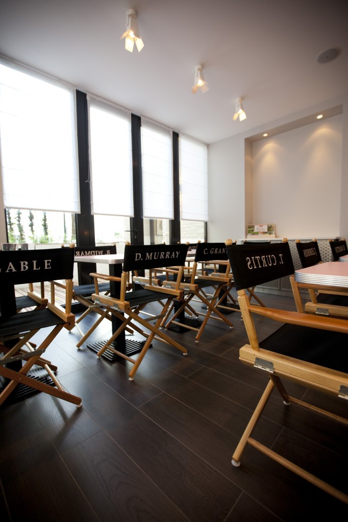 Vous pourrez savourer la très jolie vue de New-York la nuit en vous installant dans ces chaises de fast-food chic couleur lagon. Et pour les amateurs de cinéma hollywoodien, des fauteuils de réalisateur portant des noms d’acteurs célèbres (Tony Curtis, Clark Gable, Cary Grant…) sont à votre disposition.