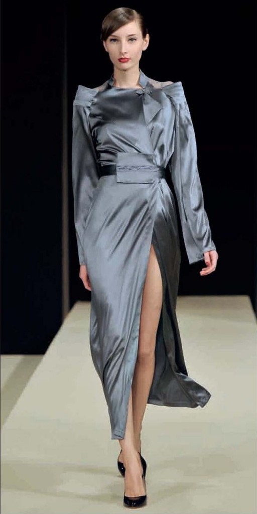 La collection Prêt-à-Porter La Perla est également empreinte de touches orientales. Veste kimono à manches pagodes et col Mao à peine réveillés d’or et de carmin sont autant de détails évoquant le style oriental. Le corsage se fait plissé façon origami toute en élégance. Des broderies dorées ornent une robe longue en velours dont le décolleté du dos audacieux se termine par un cordon.