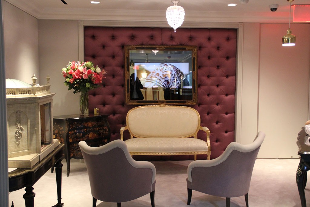 Rideaux en soie, parquet en chêne brossé, lustres en cristal et chaises d’époque viennent embellir l’intérieur d’une boutique à la palette douce et sensuelle mêlant le gris et l’argent, ponctuée par un mur matelassé tapissé de soie dans les tons pourpre évoquant subtilement la splendeur des Romanov.