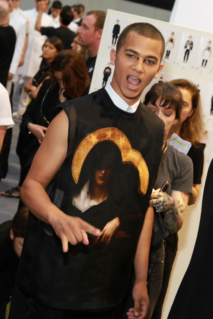 En retournant à ses racines italiennes du Sud, Riccardo Tisci s’est penché sur le culte de la communion très présent au quotidien. En le mélangeant avec une référence de Bauhaus et une iconographie riche de Madones classiques retravaillées, la collection Printemps Eté 2013 de Givenchy Hommes rassemble romantisme et icônes religieuses sur des tee-shirts, sweats et blousons.