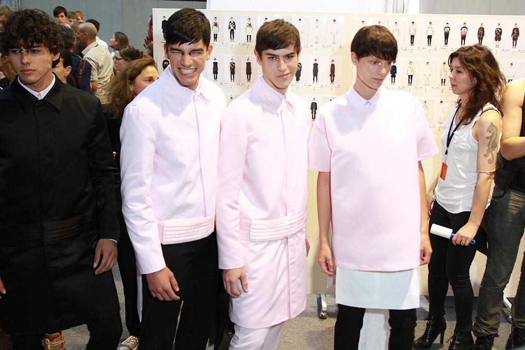 Les chemises et autres tops se font faussement robes par le truchement d’un effet très visuel de voiles. Les teintes pastel, notamment le rose poudré, dominent, l’utilisation de matières, telles que l’organza et du satin duchesse, traditionnellement associées au vestiaire féminin surprend.