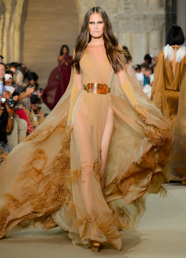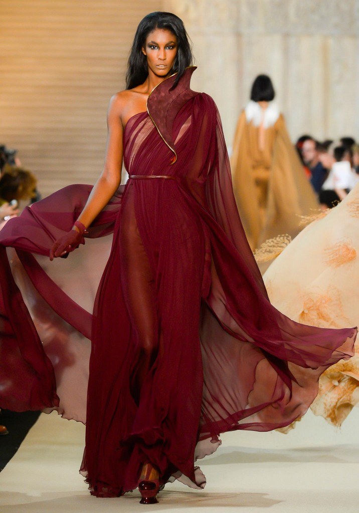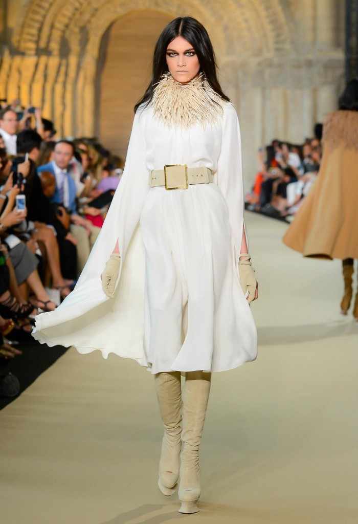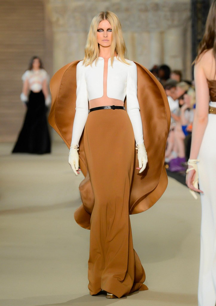 Cette saison, les robes en mousseline de soie éthérées aériennes avec de larges manches et les combinaisons-capes donnent le ton. Le créateur fait la part belle aux traînes majestueuses et autres envolées de tissus explorant ainsi l’un de ses thèmes de prédilection : le mouvement. A la fois enveloppante et protectrice, la cape semble être la nouvelle armure d’une femme conquérante pleine de prestance.