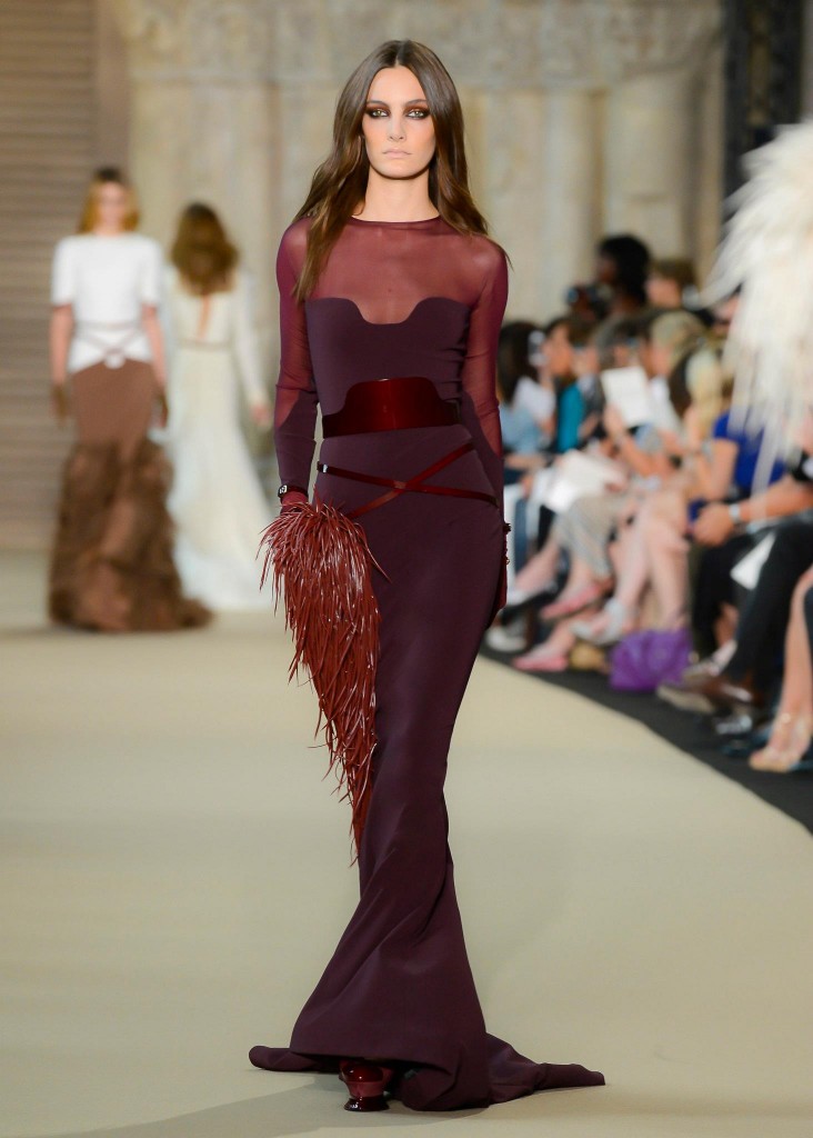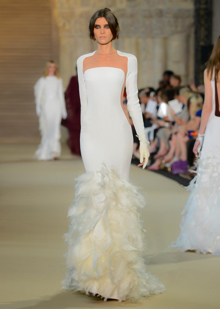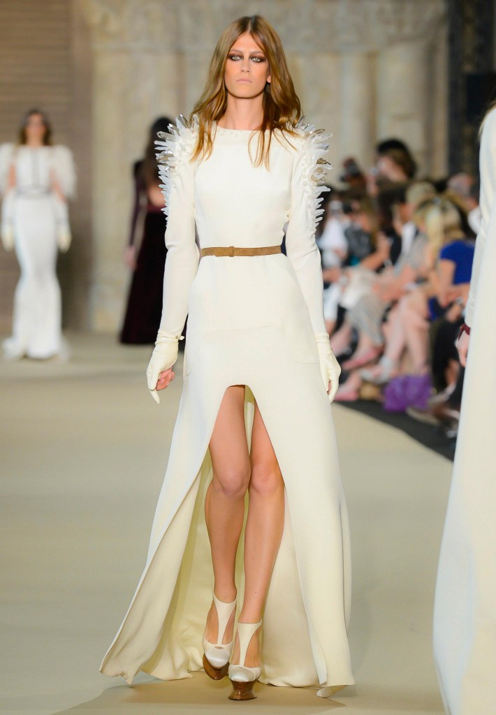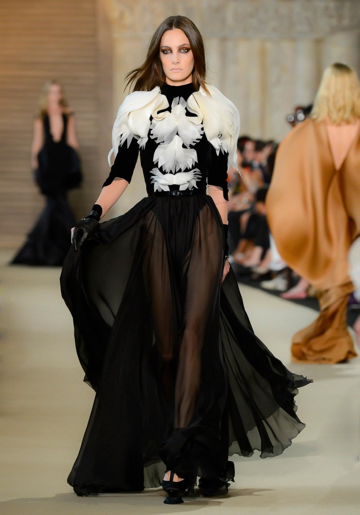 Les manches à traines et les ailerons flottent, les bas de robes frémissent brodés d’aiguilles et de feuillages d’organza effiloché. Architecte du vêtement, Stéphane Rolland s’est inspiré des œuvres du designer finlandais Alvar Aalto pour nous livrer des fourreaux à la coupe parfaite faite d’arrondis et de lignes pures, soulignant les formes sans pour autant les accentuer.