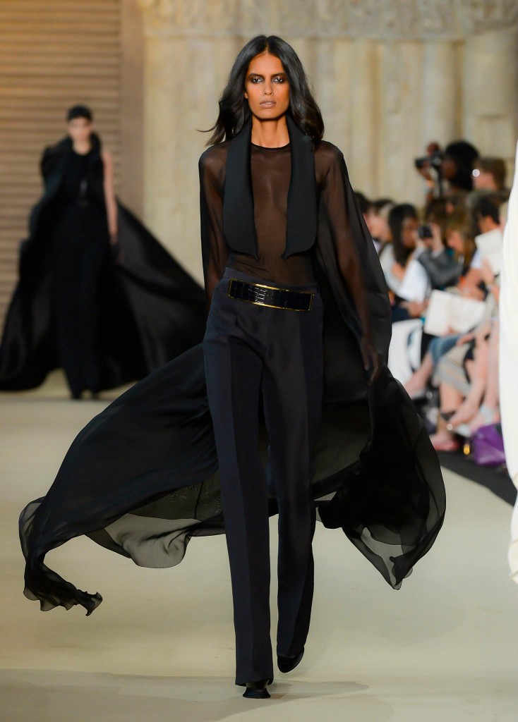La collection fait aussi la part belle au smoking, pièce ultime réaffirmant l’élégance d’une femme indépendante, un brin amazone qui réaffirme son style tout en prenant des risques. Revisité sous toutes ses formes, cette pièce phare joue tantôt sur la transparence, tantôt sur la cape pour se réinventer mais reste une valeur sûre que le couturier a su sublimer en l’accessoirisant de gants à la découpe originale ne couvrant que deux doigts.