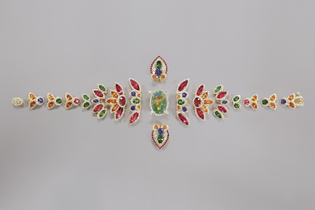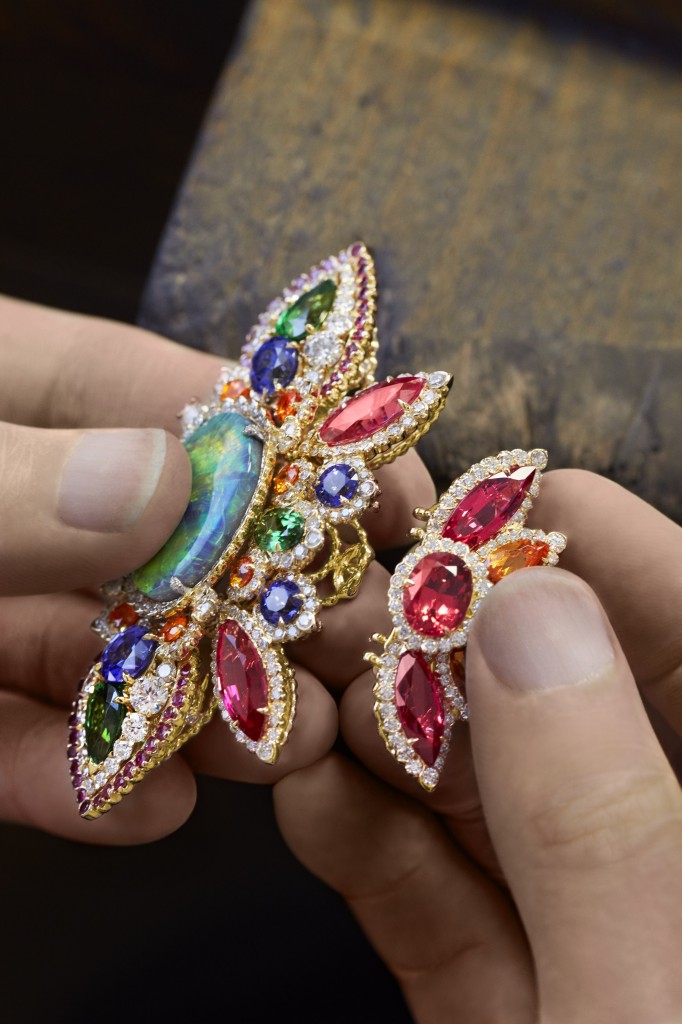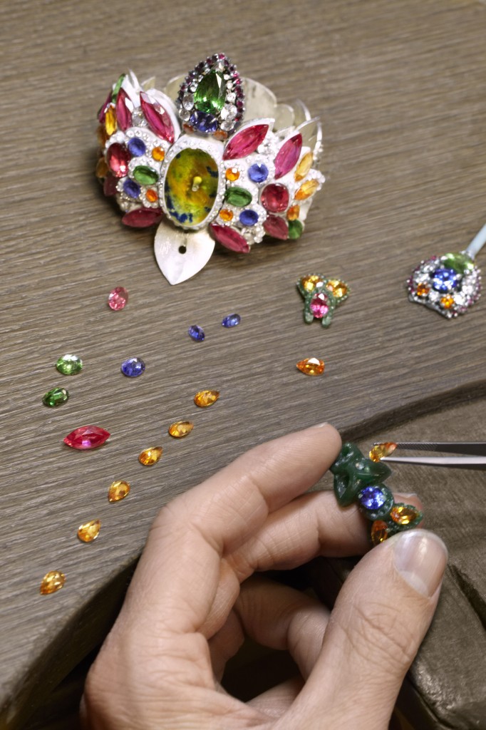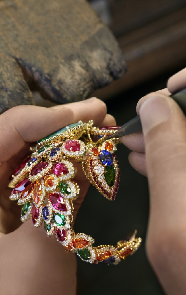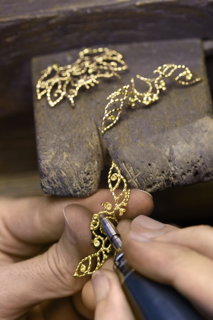 Le joaillier travaille l’or pour créer la fameuse dentelle qui donne son nom au bracelet, avant de sertir chaque élément de rubis, de grenats, de diamants et de la fameuse opale noire centrale.