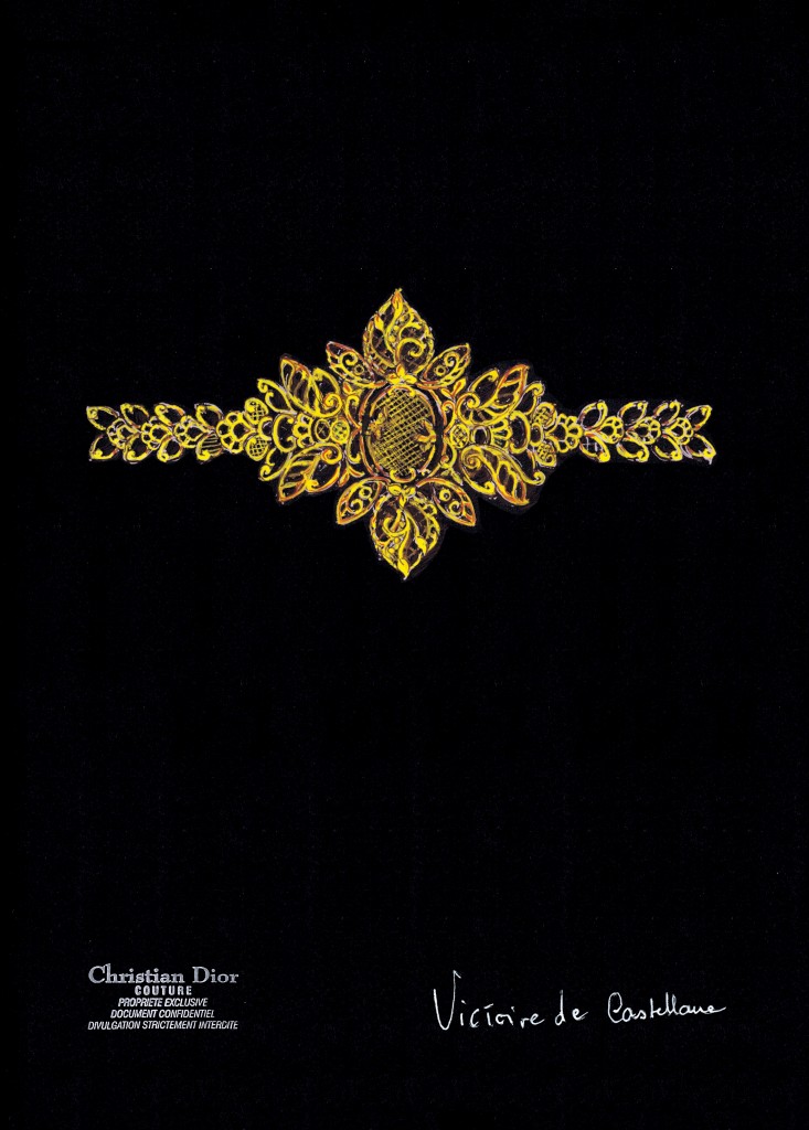 Au départ vient la création. Le modèle est entièrement réfléchi puis dessiné par Victoire de Castellane qui va ensuite travaillé avec son équipe de dessinatrices en charge de dessiner à la gouache de manière très précise et à l’échelle qu’il faut les créations pour les ateliers.