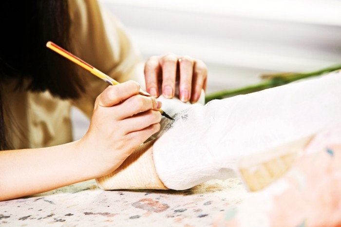 L’artiste a exprimé toute la puissance de son art sur la partie supérieure de la botte, constituée d’une feuille de papier de riz, dans un jeu de couleurs qui s’impose comme une empreinte indubitable.