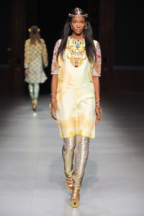 La luxuriance atteint son paroxysme grâce aux bijoux spécialement imaginés par la marque de joaillerie indienne Amrapali pour l’occasion. Inspirée par les ornements de la royauté indienne, ces bracelets et des boucles en plaqué or traditionnelles et pourtant furieusement modernes mêlent pierres, cristaux colorés et pompons et habillent poignets, cous, doigts et même le visage des mannequins pour en faire des princesses des temps modernes, majestueuses sur ses compensées à lanières or Giuseppe Zanotti.