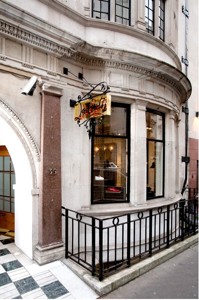 D’un coup d’œil, on repère la boutique grâce à son enseigne reprenant la signature calligraphiée de la marque en lettres noires et de feu sur fond doré, se fondant totalement dans le style géorgien de la façade. Dans le plus pur respect de la tradition, la pointe de l’enseigne rappelle le pourquoi de la boutique formant une semelle semblant indiquer le chemin.