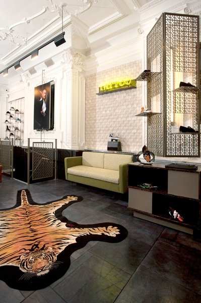 Une peau de tigre brodée par Jean-Francois Lesage habille l’espace au sol restant contrastant avec le noir du parquet. Les détails luxueux se multiplient de sorte que le client se sente à l’aise à mille lieues du cadre strict d’une simple boutique.