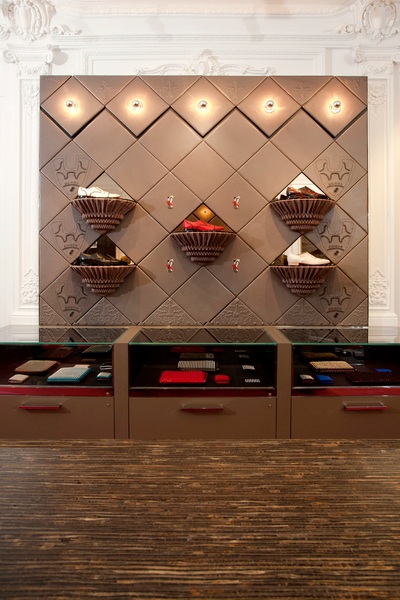 A l’instar des autres boutiques Hommes de la marque, des incrustations de diamants viennent orner les murs tapissés de cuir. Meubles en matériaux naturels et sièges faits sur mesure complètent un design chic et contemporain.