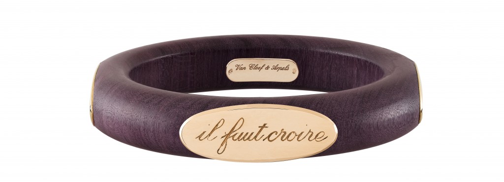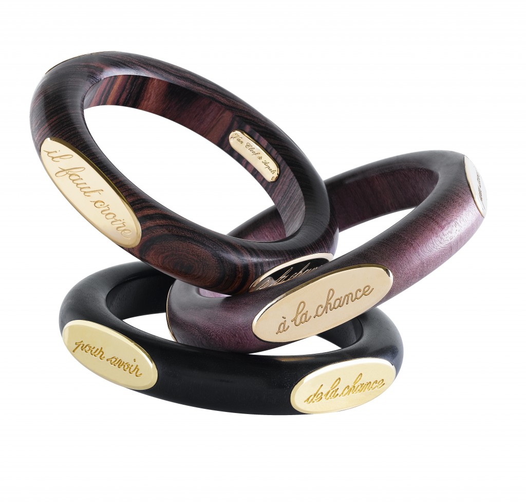 En ce début d’année 2013, la maison de joaillerie Van Cleef & Arpels nous dévoile un véritable bijou porte-bonheur à porter au poignet : un bracelet en bois marqué de la maxime emblématique de la célèbre maison. Alliant bois précieux et or finement gravé, le bracelet Croire à la chance se dévoile sous un jour nouveau tout en élégance et sobriété, remettant à l’honneur les bijoux en bois, chers à la Maison de joaillerie de la Place Vendôme. Connue pour ses sublimes créations de haute-joaillerie utilisant les plus belles précieuses, la maison Van Cleef & Arpels l’est moins pour ses créations mettant à l’honneur le bois, matière porte-bonheur par excellence. En effet, ne dit-on pas « Touchons du bois » pour nous porter chance, comme nous le rappellent très justement les anciennes publicités de la célèbre maison de joaillerie ?