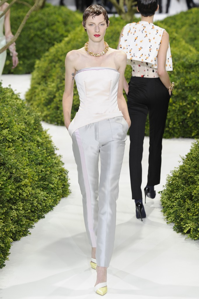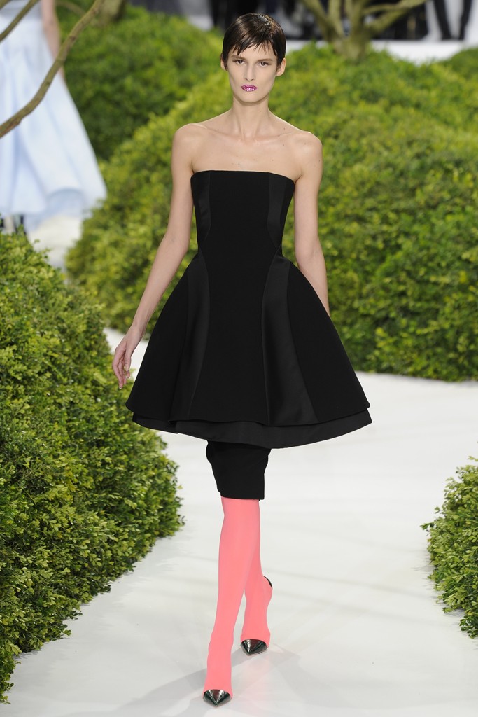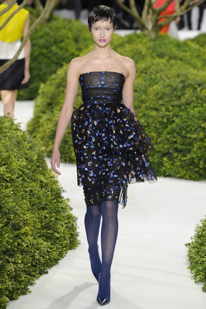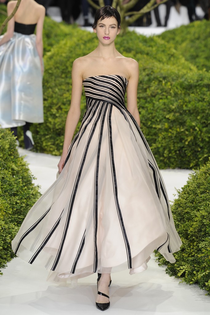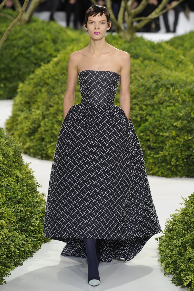 La silhouette emblématique New Look est bien là, plus moderne et surtout plus graphique, la taille est marquée, la jupe ample, portée mi-mollets. Très respectueux du protocole Dior, Raf Simons ouvre le défilé avec un quatuor de silhouettes New Look du XXIe siècle, en lamé marbré et rayé. Le noir contraste avec les pastels irisés et sensuels des jupons bleus.