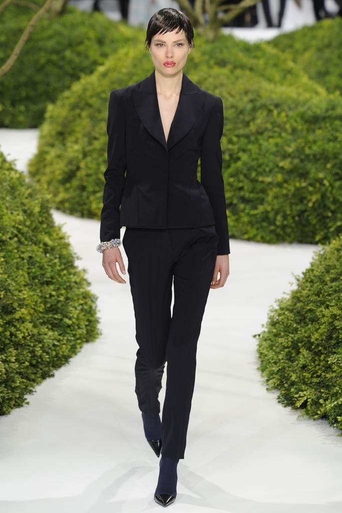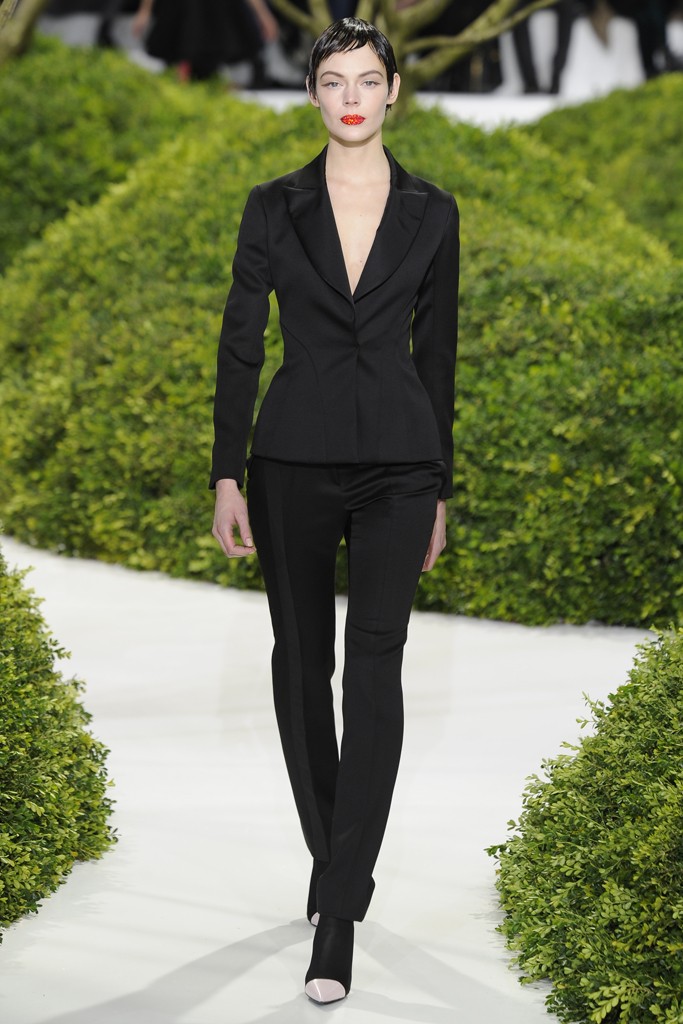 La célèbre veste Bar est raccourcie dans d’impeccables smokings noirs aux épaules étroites, tandis qu’elle rallonge plus loin, portée sur une jupe crayon et des collants roses. La matière est travaillée avec une extrême dextérité.