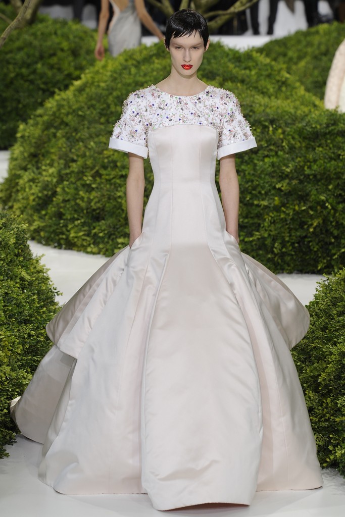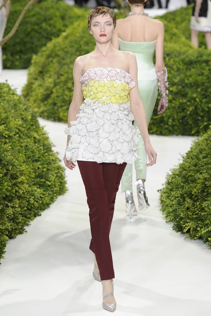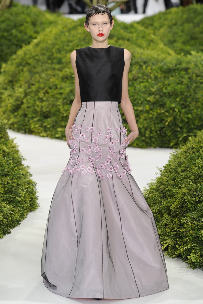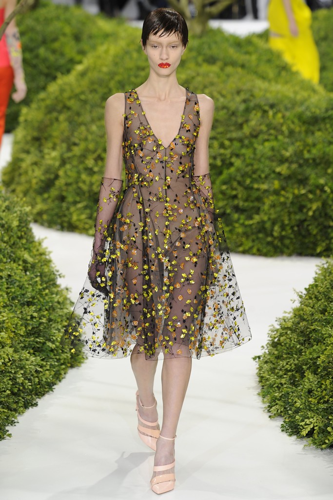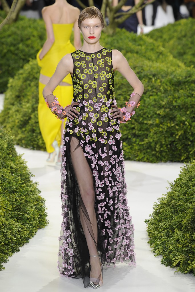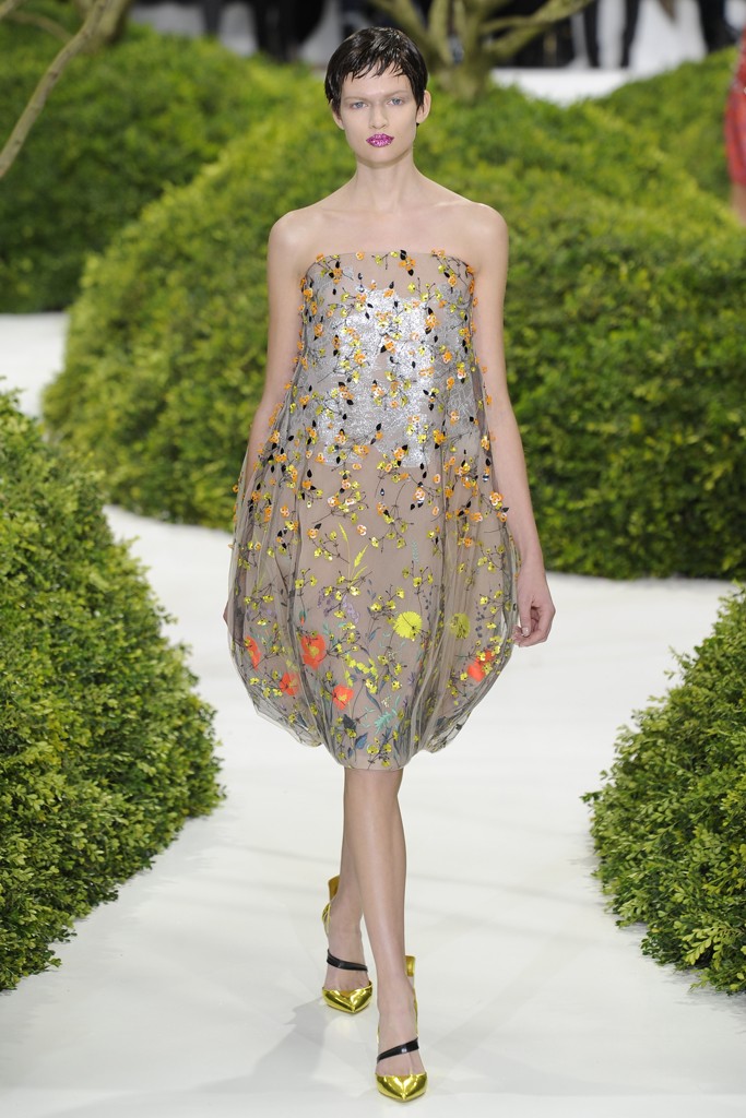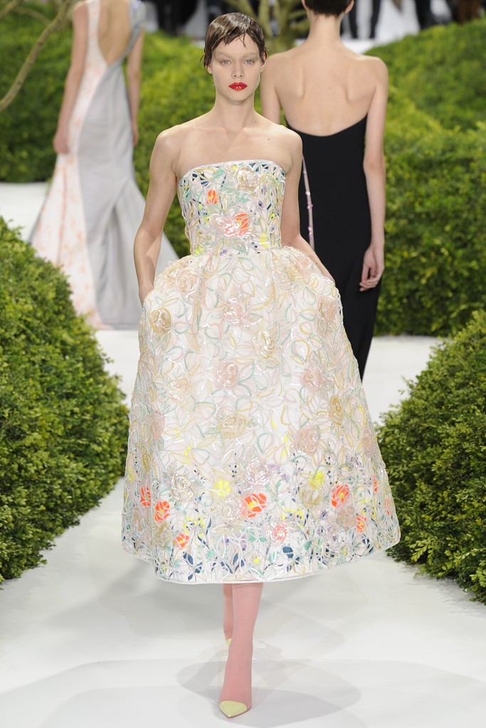 Comme un écho aux femmes-fleurs du premier défilé de Haute-Couture de Monsieur Dior, Raf Simons lie passé et présent dans une collection fourmillant de broderies de fleurs légères en couches successives issues des ateliers maison et des broderies Vermont que la marque a rachetée en 2012.