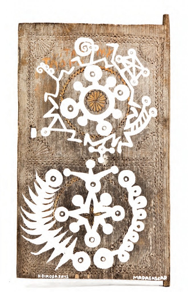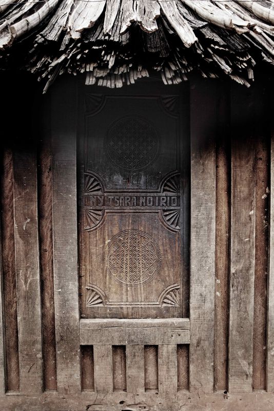 Les signes, gravés sur les portes et volets, disposés face aux quatre points cardinaux, rappellent les rayons du soleil, de l’abeille et de sa ruche qui forment la communauté idéale. Mais aussi l’oiseau qui toujours voit de loin, le serpent, discret maître des sentiers forestiers, l’araignée, la petite bête au grand territoire. Organisés selon des combinaisons ésotériques, ces signes reflètent les croyances populaires des malgaches et les relations que ces derniers entretiennent avec le monde invisible.
