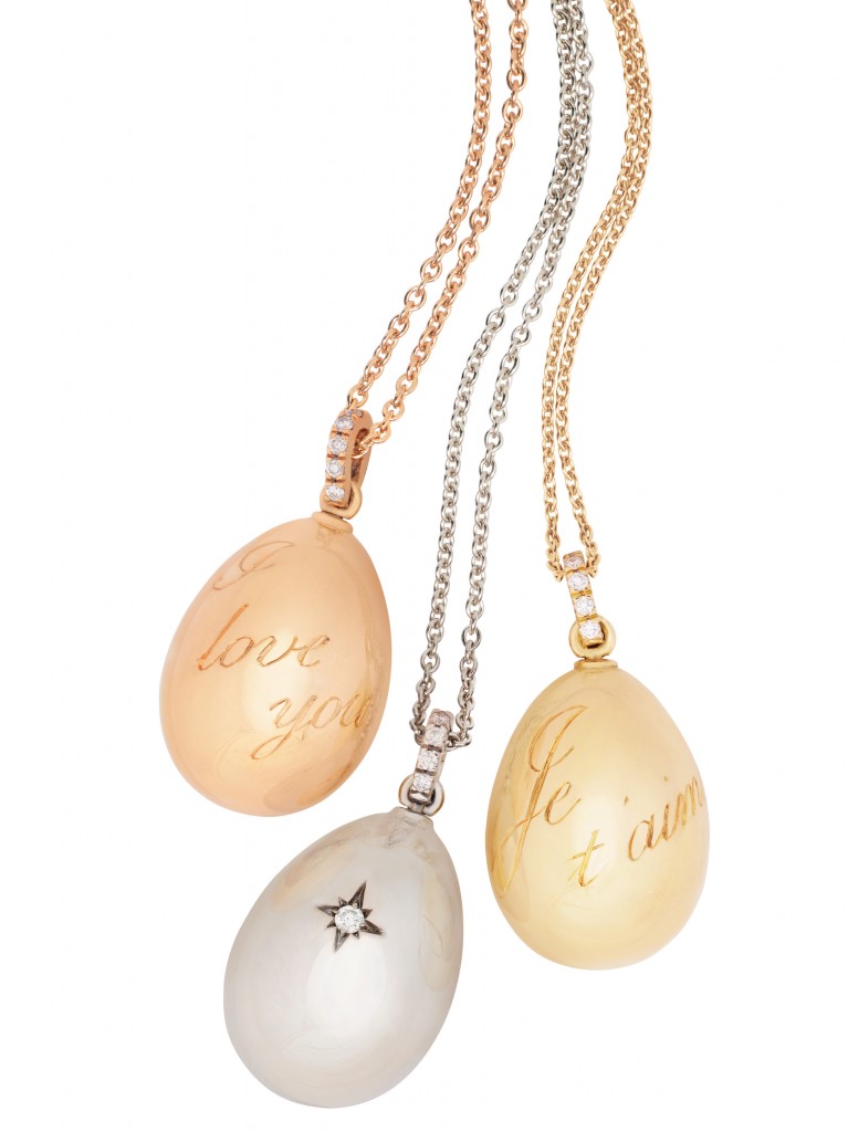 Serment d’amour éternel à l’élu de votre cœur, ses nouveaux oeufs-pendentifs se déclienent en or blanc, rose ou jaune simplement gravés de quelques mots d’amour : Je t’aime ou I love you. L’anneau sur lequel le pendentif est suspendu à la chaîne est en or pavé de diamants et à l’arrière de l’œuf est incrusté un diamant.