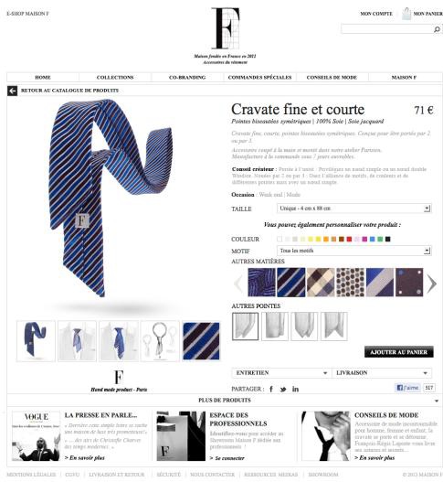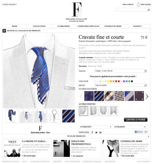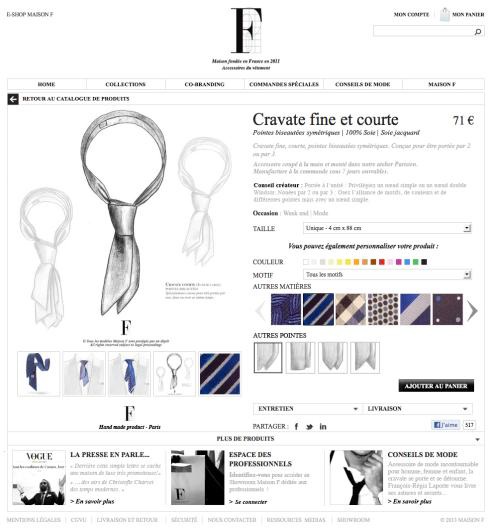 Plate-forme unique en son genre, le E-Shop Maison F est ludique et fonctionnel et ne propose que des pièces « sur-mesure » parmi les 1840 modèles de cravates, nœuds papillons, pochettes, ascots ou foulards proposés dans un choix de 120 tissus.
