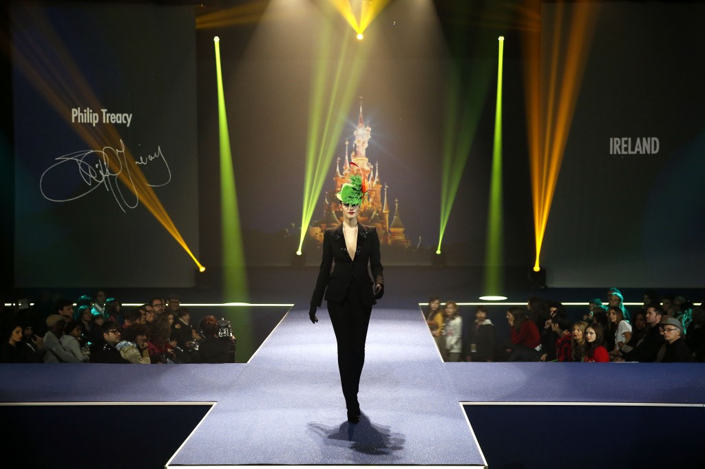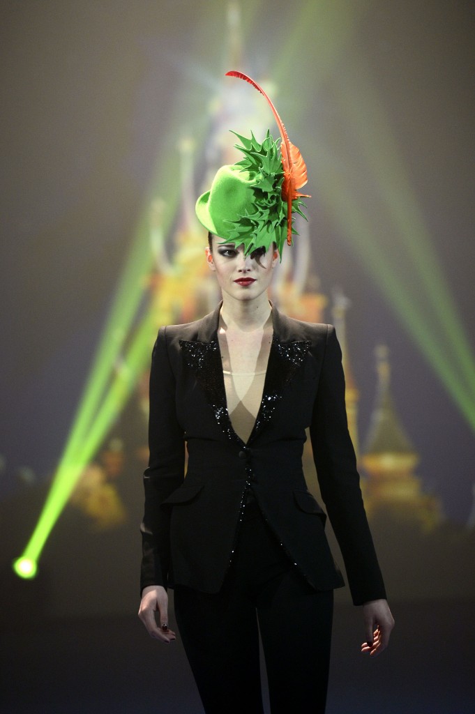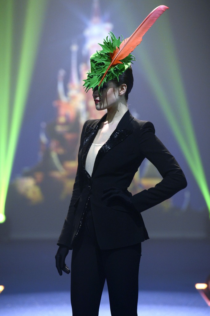Philip Treacy nous transporte vers le Pays Imaginaire. Le chapelier irlandais a créé un chapeau dans les tons de vert et orange, sublimé par la poussière d’étoiles et inspiré du vol de Peter Pan.