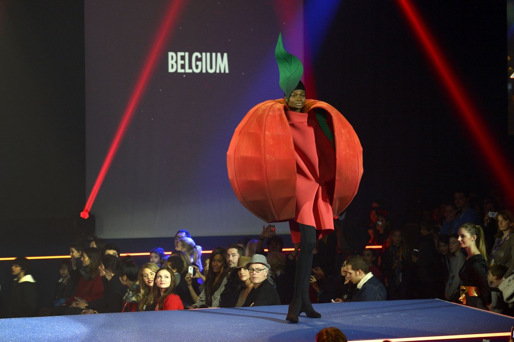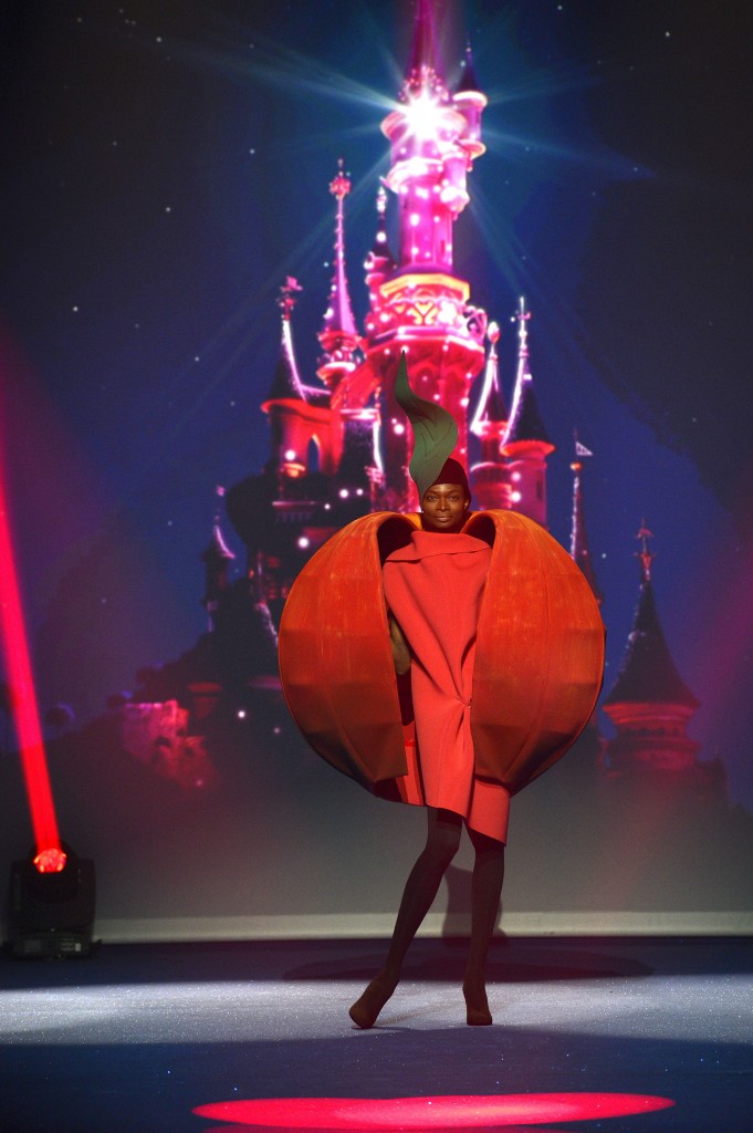 Le créateur belge, ancien adjoint d’Yves Saint-Laurent a imaginé une robe inspirée de la pomme de Blanche-Neige à la cape-sphère légère et rigide enveloppant une robe très simple dans un rouge proche de celui du film.