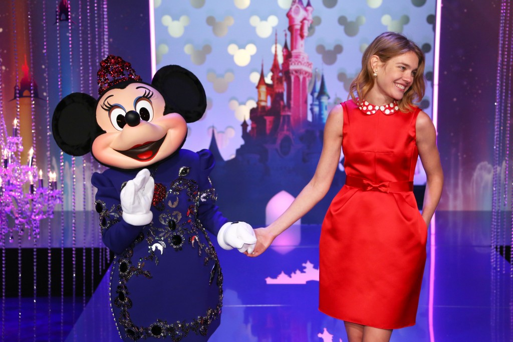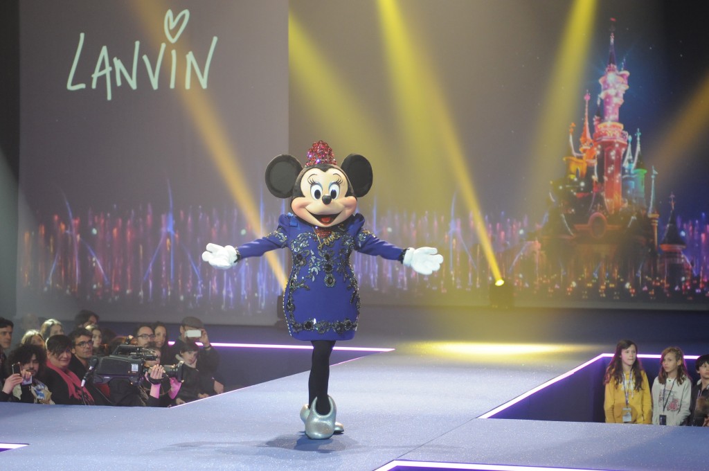 Minnie, qui d’habitude revêt des robes rouges à pois blancs, a défilé pour la première fois dans un modèle couture, une robe de cocktail bleu Lanvin rebordée de miroirs, dessinée spécialement pour elle par le créateur Alber Elbaz.