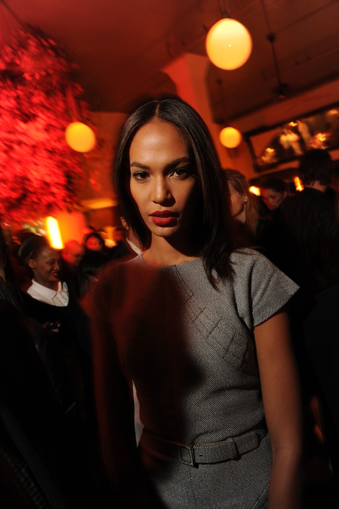 Le top Joan Smalls portait un combishort en tweed de coton gris issu de la pré-collection Chanel Printemps-Eté 2013 qui dévoilait ses jambes fuselées, des sandales aux talons métalliques Giuseppe Zanotti et une fine pochette en cuir noir.