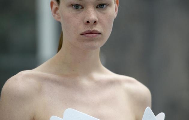 Yvonne Poei-Yie Kwok nous interroge sur le rôle de la mode dans nos vies quotidiennes. La jeune Néerlandaise, déjà récompensée par deux prestigieux prix à Londres et Amsterdam, nous offre une collection architecturale au travail manuel minutieux fait de nombreux plissés accordéons.