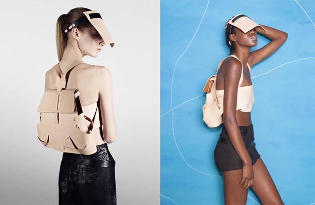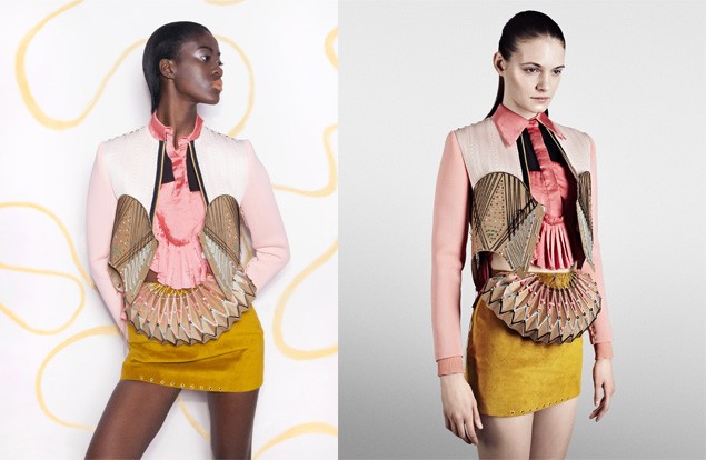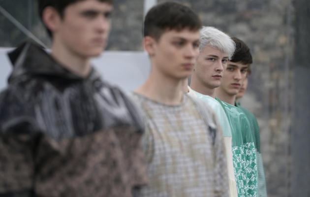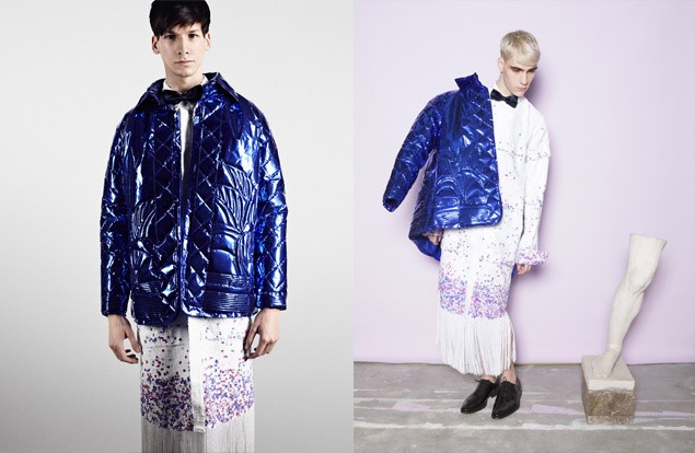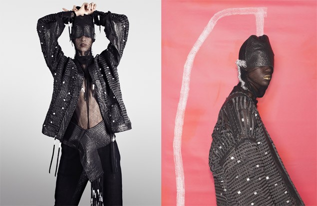 Venant respectivement de Lettonie et de Russie, le duo Tomas Berzins et Victoria Feldman se sont rencontrés sur les bancs de l’école de mode Esmod à Paris. Le duo a présenté une collection sombre et agressive inspirée par la guerre, faite de cuirs noir contrastant avec des pièces transparentes plus féminines.