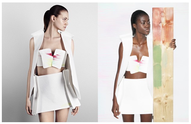 Originaire du Canada, Xing Su invite les consommateurs à prendre un rôle indispensable dans leur habillement. Sa collection très structurée est un parfait équilibre entre pure création et esprit couture joue la carte monochrome avec des accents flashy sur le buste et des bas volumineux.