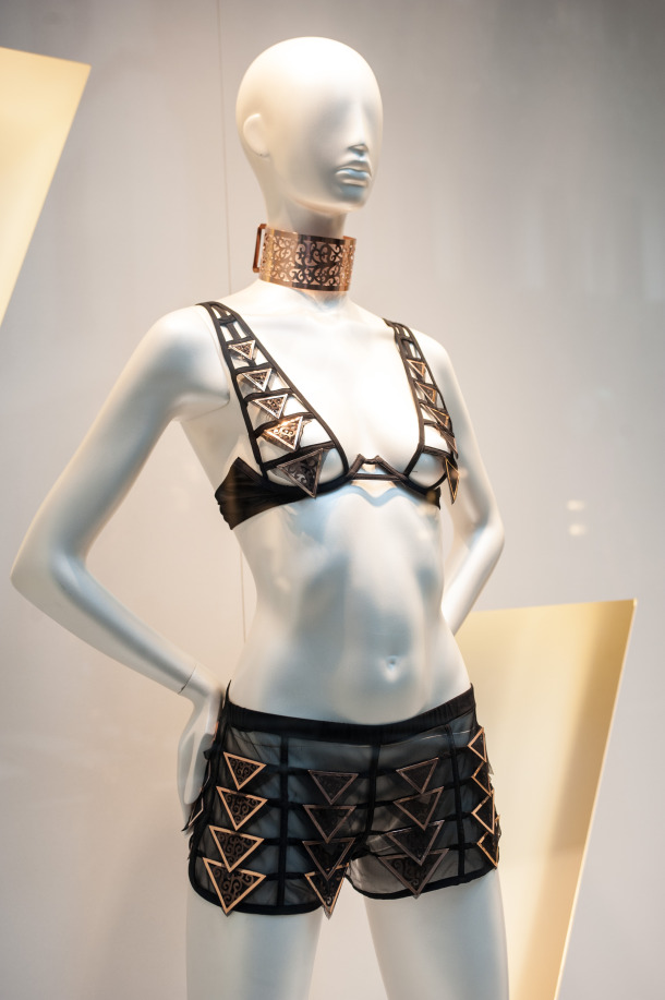 Le choix de l’or rose n’est pas anodin pour l’artiste puisqu’il renvoie aux couleurs méditerranéennes où le blé, la terre cuite, la pierre et le soleil exaltent l’intensité de la lingerie noire.