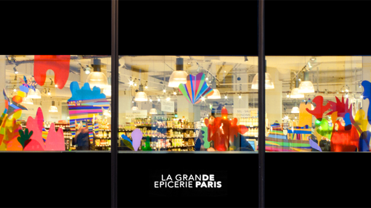 L’artiste a investi les vitrines de la rue de Sèvres pour y installer son univers un brin psychédélique, habité par des formes abstraites qu’il réalise avec du vinyl adhésif bleu, jaune, rouge, vert. Un véritable dépaysement.