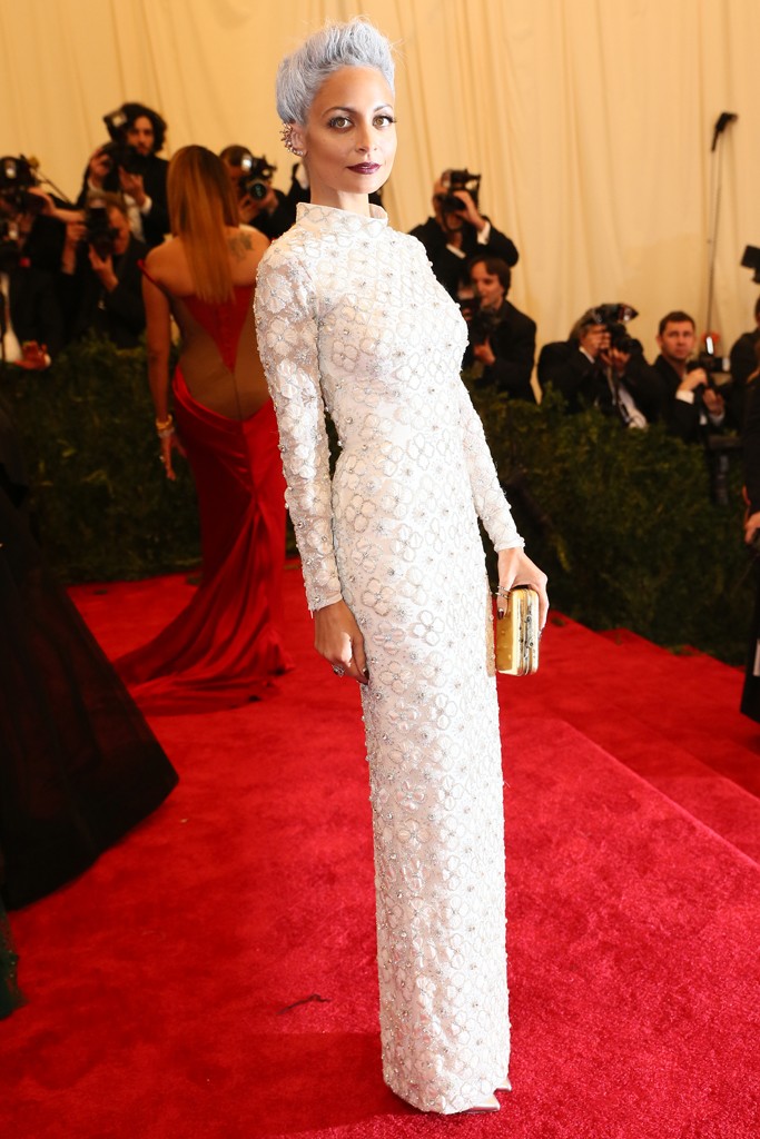 Nicole Richie avait pour une fois abandonné son look hippy chic pour se métamorphoser en punk couture dans un fourreau blanc long rebrodé de perles Topshop, les cheveux teints dans un surprenant blanc grisé.