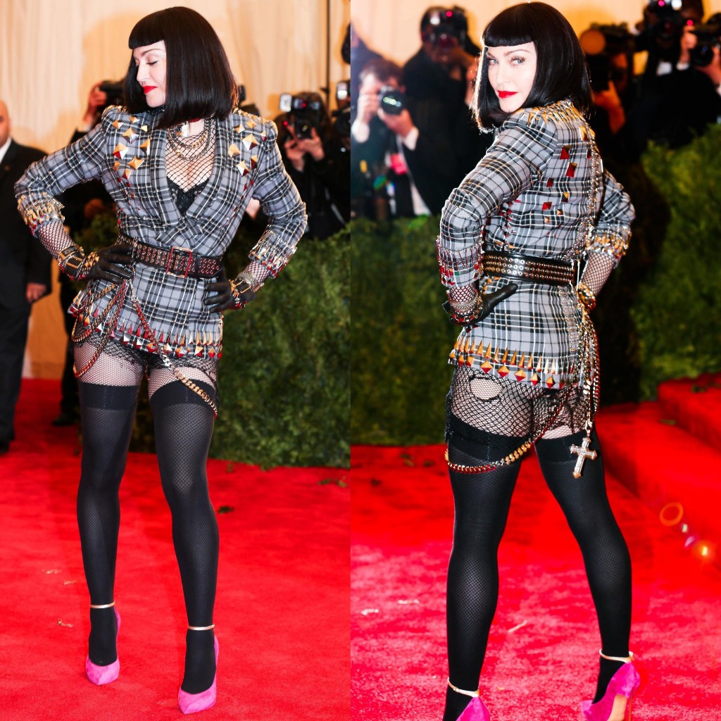 La reine de la provocation Madonna s’est affichée en lolita grunge, chaussée d’escarpins Casadei roses et perruque noire vissée sur la tête. Dans un ensemble tartan clouté Givenchy Haute Couture by Riccardo Tisci, serré à la taille par une ceinture façon militaire, l’héroïne de Recherche Susan désespérément semblait être de nouveau parmi nous avec ses bas et ses résilles troués.