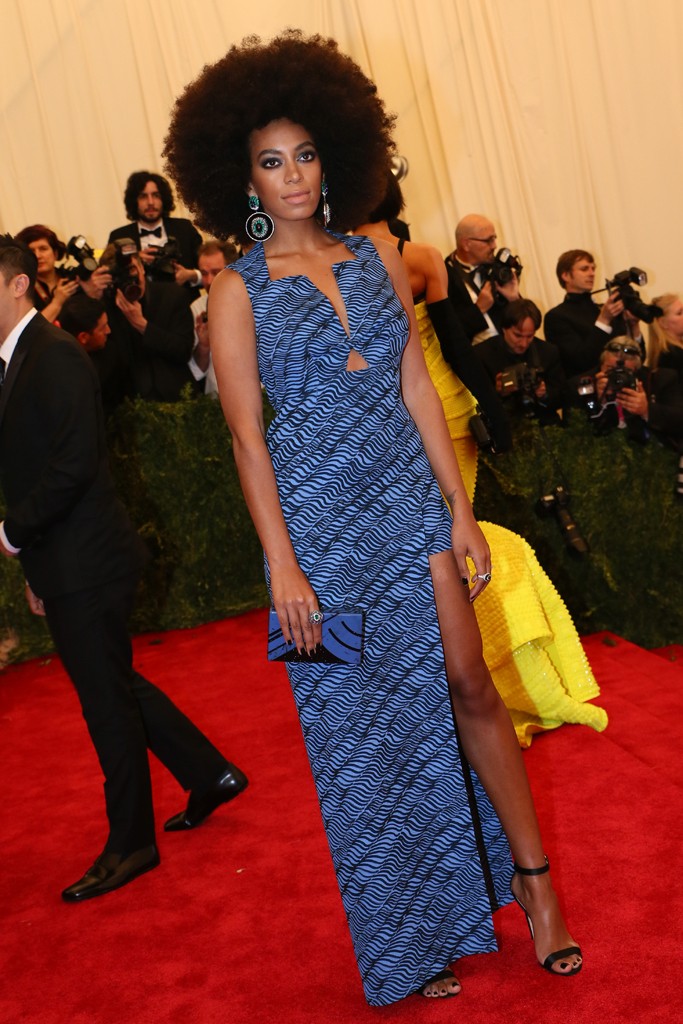La reine du mix’n’match Solange Knowles est apparue dans une magnifique robe bleue Kenzo avec des bijoux Lorraine Schwartz et une minaudière Edie Parker.