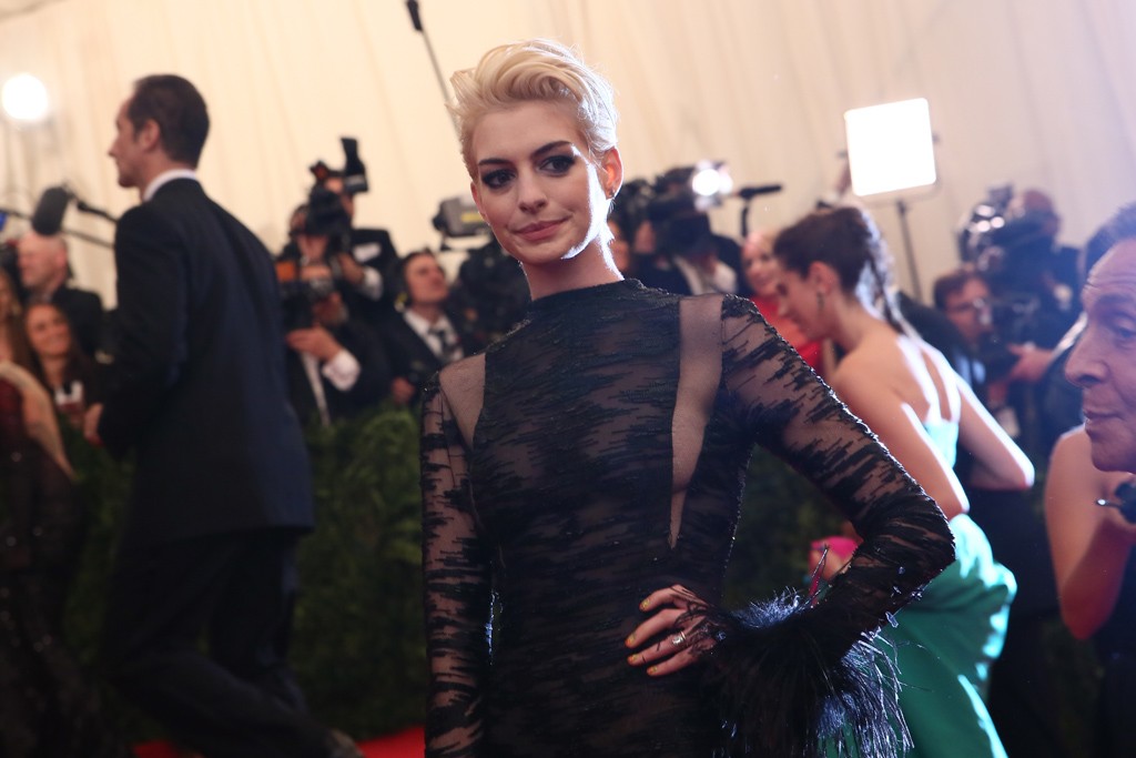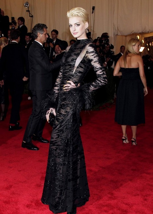 Anne Hathaway nous a bluffés en se réinventant avec élégance. Devenue blonde en hommage à Debbie Harry – la chanteuse du groupe Blondie – l’actrice récemment oscarisée faisait une composition parfaite entre esprit punk et élégance dans une robe longue noire Valentino vintage aux sensuelles transparences aux poignets bordés de plumes noires.