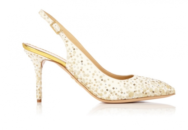 Comme un rappel du fameux label jaune, les talons en satin blanc et les plateformes Carmen se parent de broderies gold.