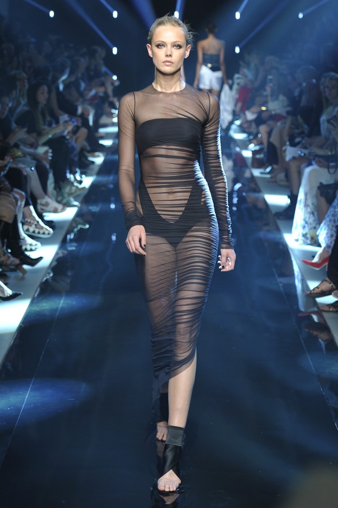 Le créateur dose savamment ses effets pour ne jamais tomber dans l’outrancier. Une mini-robe bustier s’associe ainsi à une veste à la coupe teddy. La lingerie devient apparente mais dans de subtiles associations. Les satins de soie habillent les bustiers, les épaules se marquent.