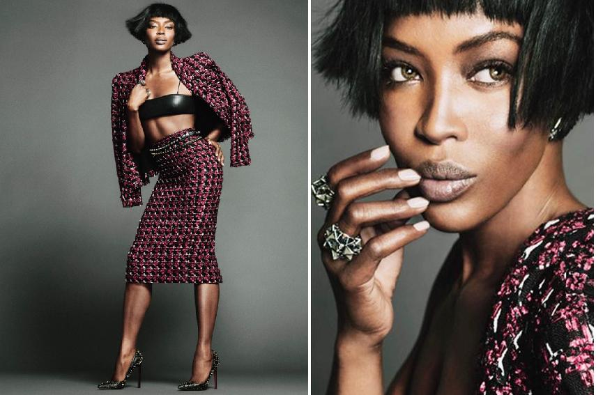 Naomi Campbell photographed by NicoJacket and skirt by Oscar de la Renta; top by Saint Laurent by Hedi Slimane; pumps by Christian Louboutin; earrings by Roberto Cavalli; (right hand) ring and ring by Bottega Veneta; (left hand) ring by Maison Martin Margiela; belt by Valentino